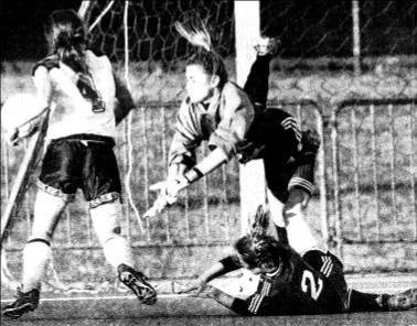 New Providence's Tara Alberse, lower right, upends Glen Rock's goalkeeper Sarah Volkomer during the second overtime period Saturday in the Group I championship game at The College of New Jersey.