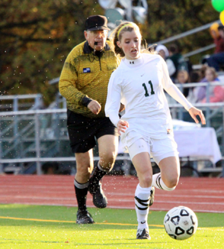 While venerable official Brian Kane remains in pursuit, New Providence's Rachel Schlobohm has separated from Kent Place defenders during this run in an Oct. 29 soccer match. Fleet striker Schlobohm scored one of the goals in a 2-0 New Providence victory that clinched the Mountain/Valley Conference championship for the Lady Pioneers.