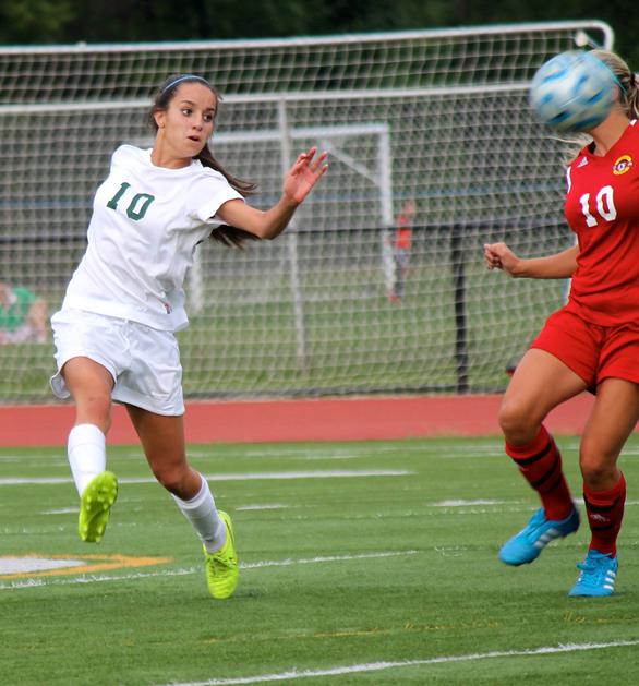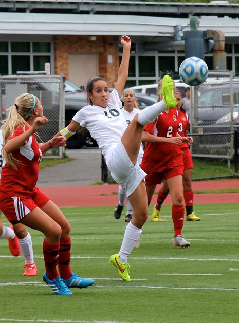 Lisa Caprara (middle) scored three times, including the game winner in the 79th minute, to lead the Pioneers to a 4-3 victory over Kearny.